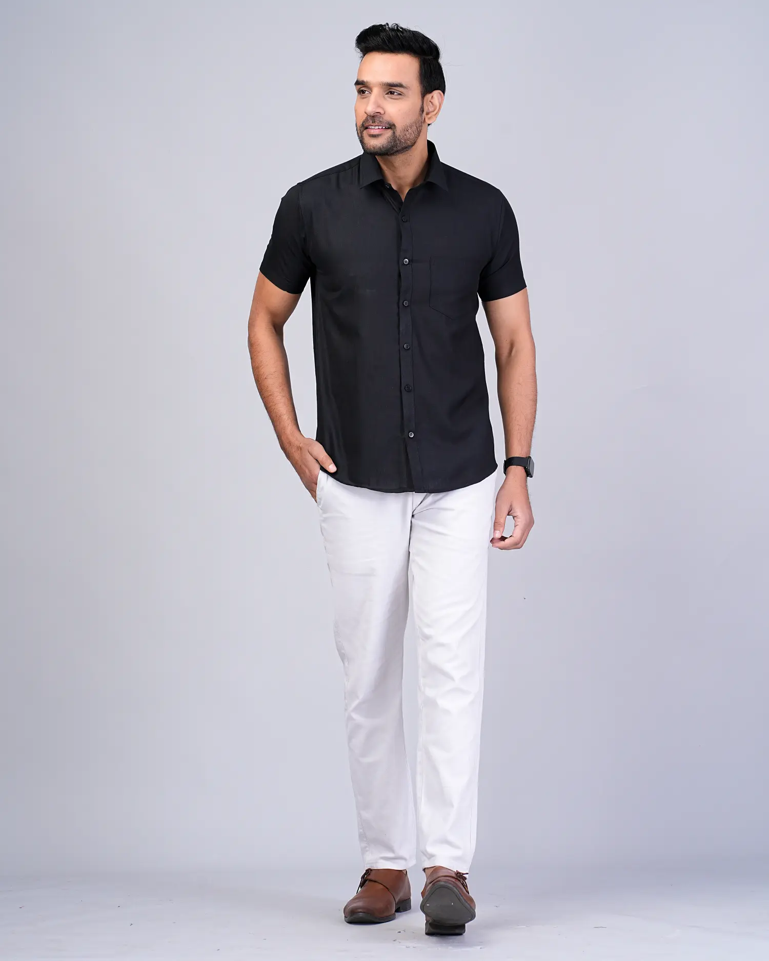 Pair the Black Colour Half Sleeve Men Formal Shirt with formal trousers, chinos, or even dark jeans for a more business-casual look. Add a leather belt and dress shoes to complete the outfit. For a sharper image, wear it tucked in with a sleek watch or a minimal blazer.