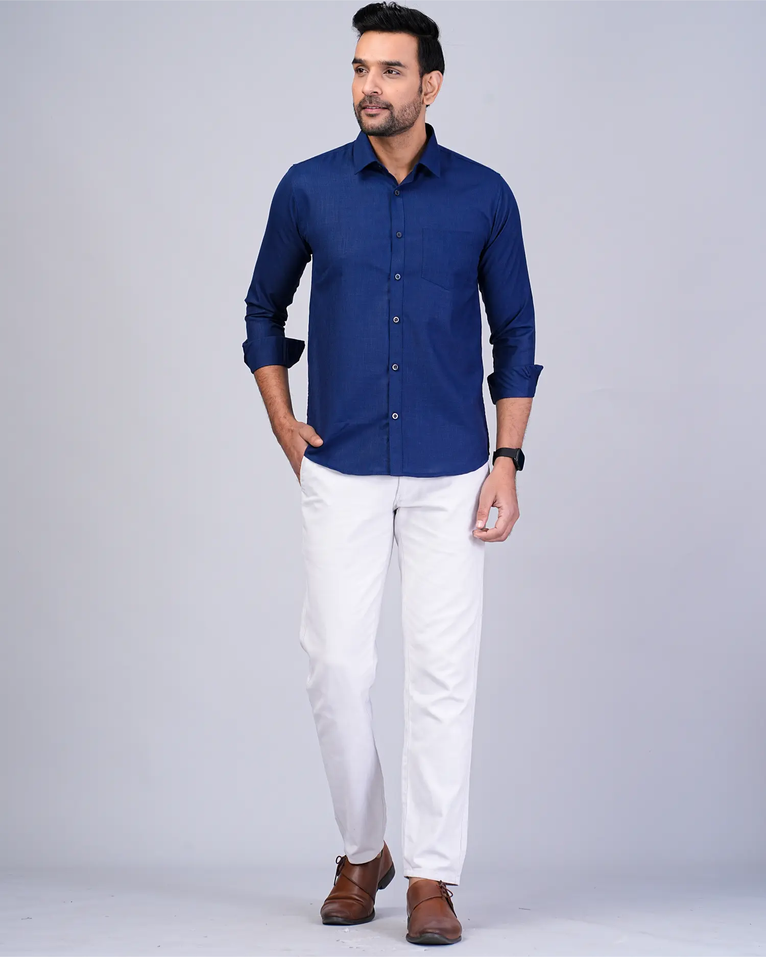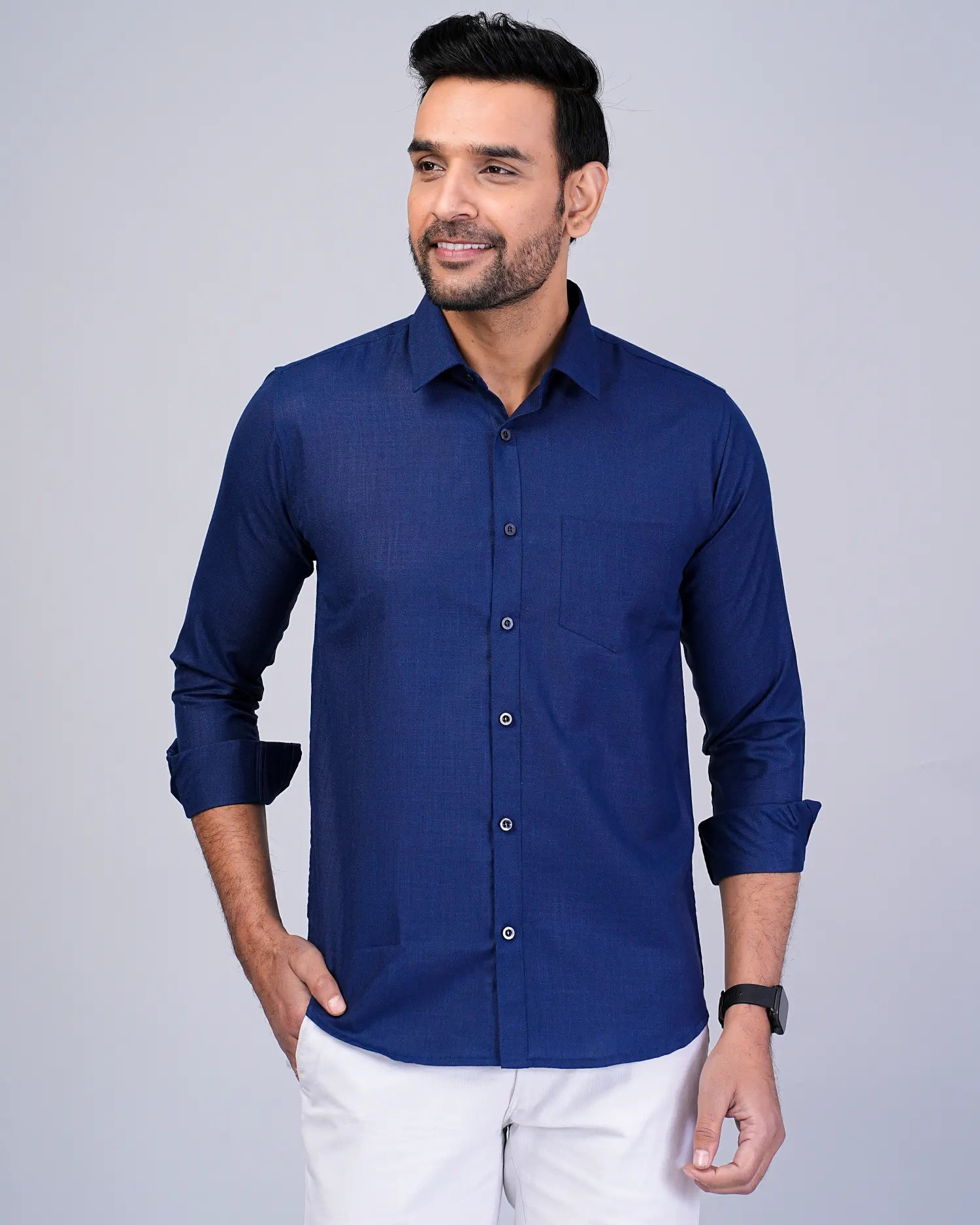 Whether you prefer a clean tuck-in with formal trousers or a semi-casual look with chinos, this shirt adapts to your style. The full sleeves can be rolled up for a relaxed vibe, while the deep blue shade pairs exceptionally well with black, grey, or beige pants.