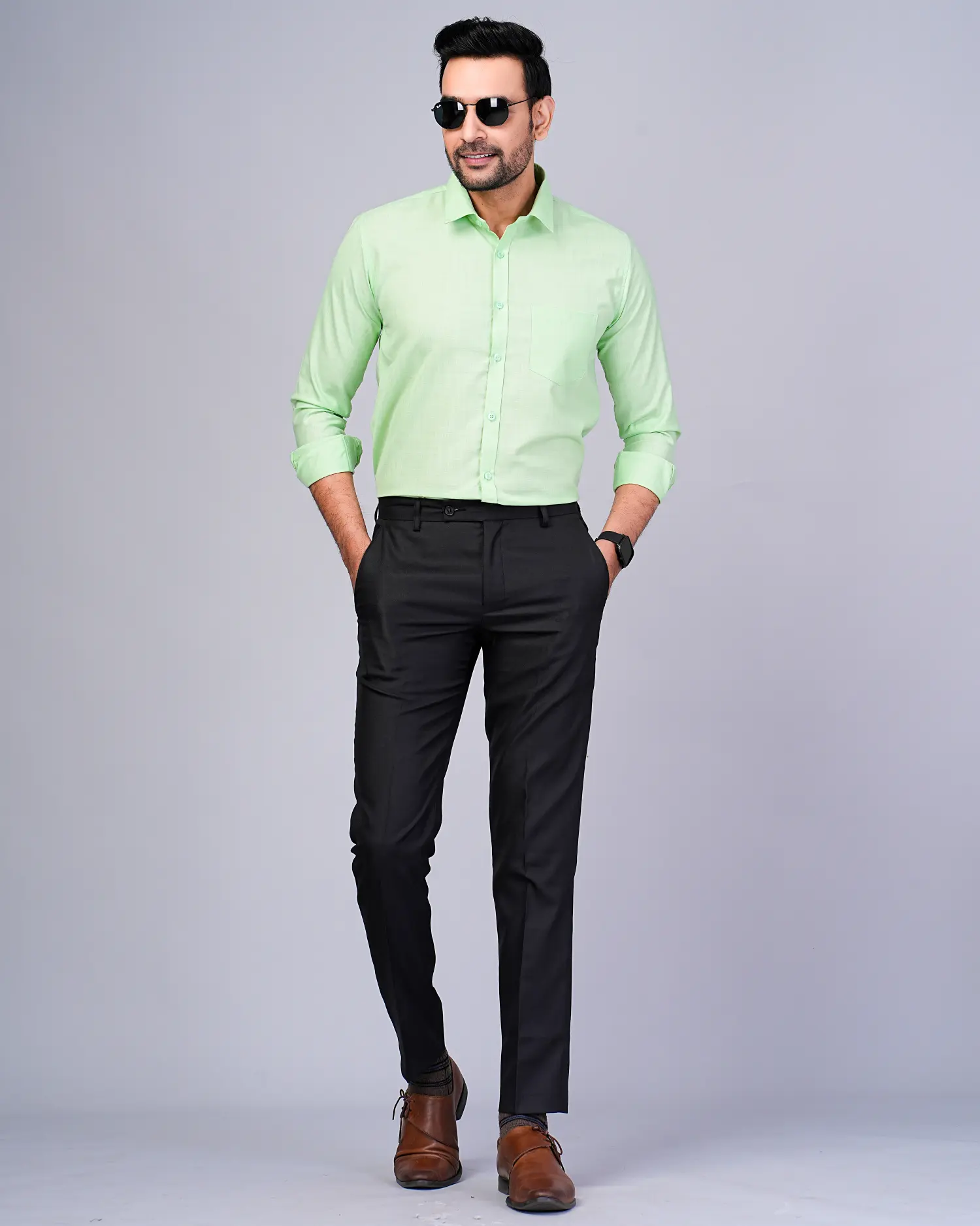 Pair this light green formal shirt with black, navy, or beige trousers for a complete formal look. For a more laid-back style, team it up with chinos or dark jeans and loafers. Whether you’re attending a business meeting or heading out for dinner, this shirt is your go-to piece.